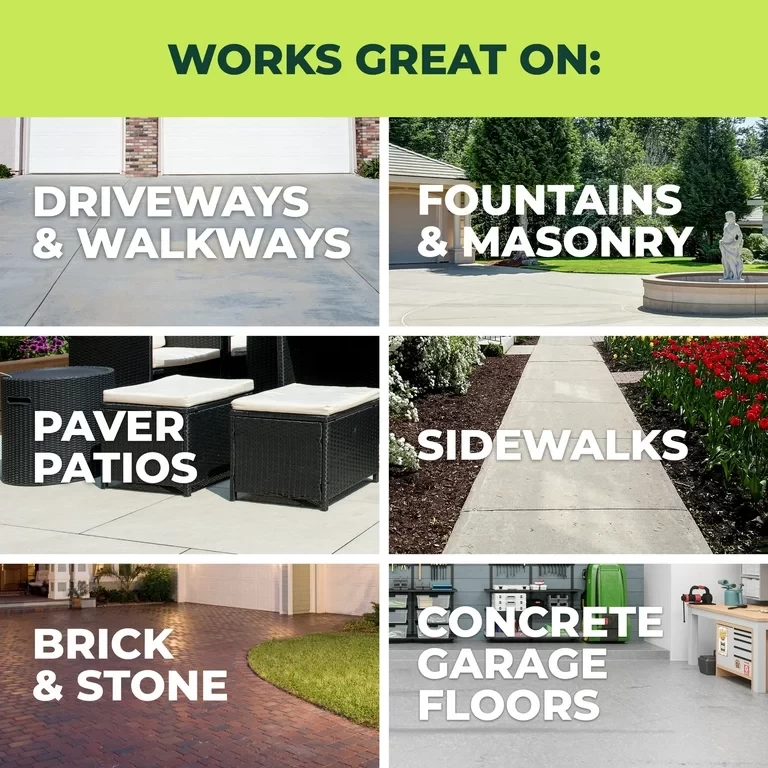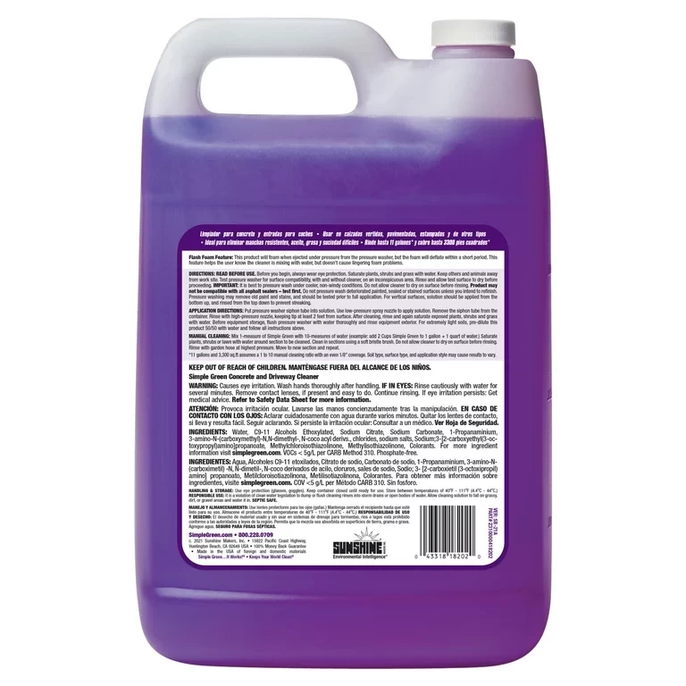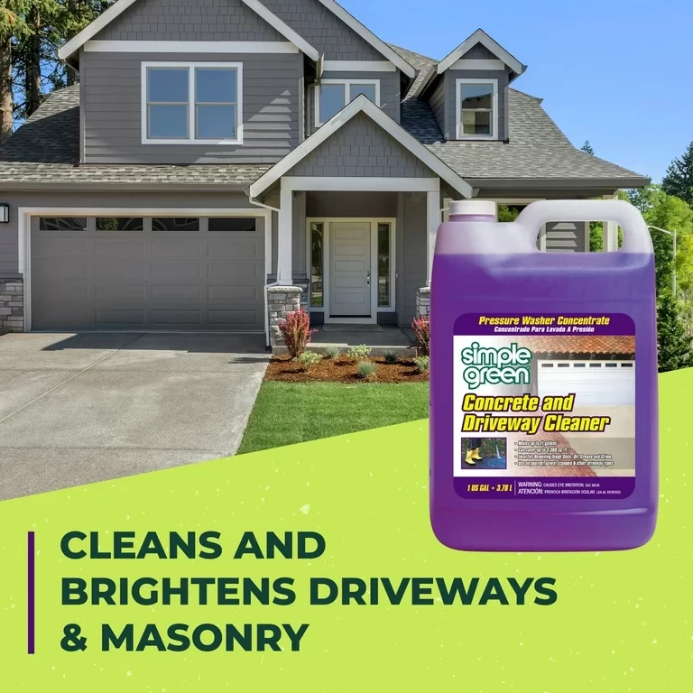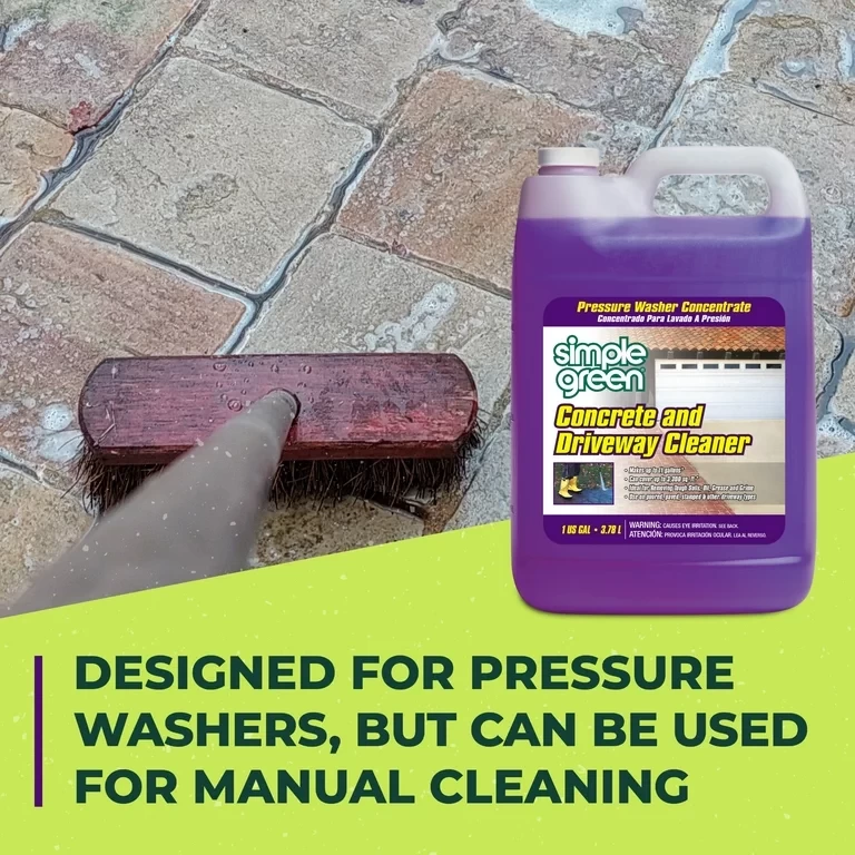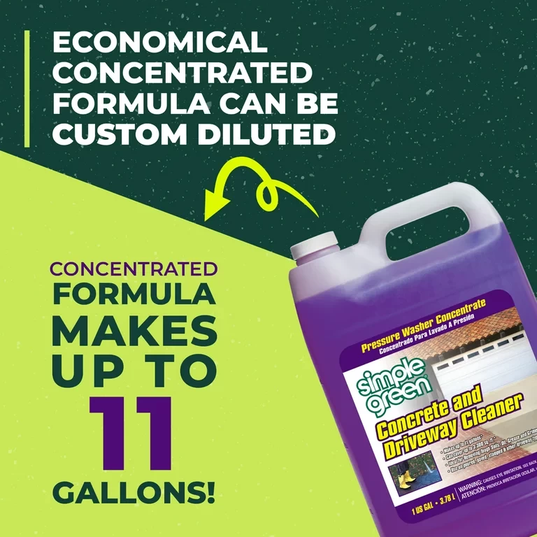 Simple Green Concrete and Driveway Cleaner is specially formulated to remove oil, grease, and grime from concrete surfaces and driveway areas. It removes most tough stains and discolorations (not caused by dyes), and is non-caustic and non-degrading. This powerful formula was developed to be used with pressure washing systems, but can also be used manually to clean concrete walkways, patios, driveways, sidewalks, and any other concrete, brick, or stone outdoor surface.
