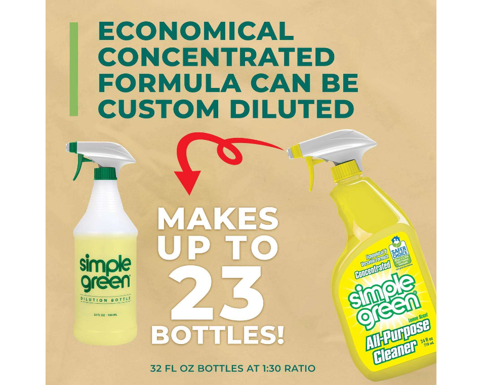 Light Cleaning – Up to 1:30 Dilution (Example: 1 oz. Simple Green + 2 cups water)