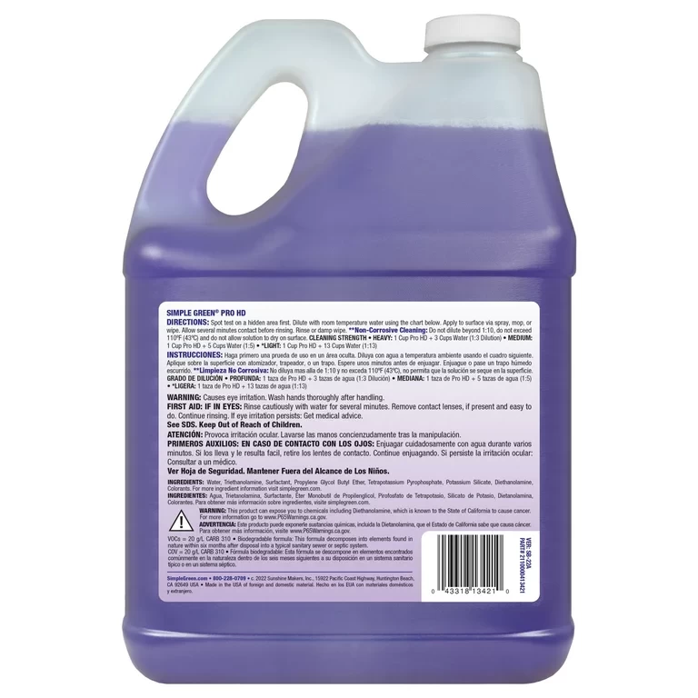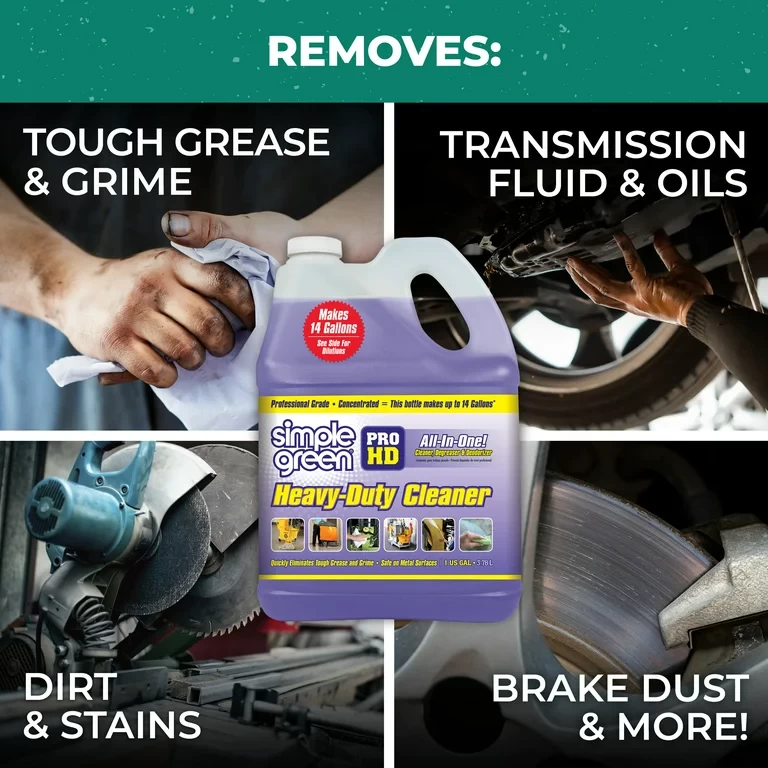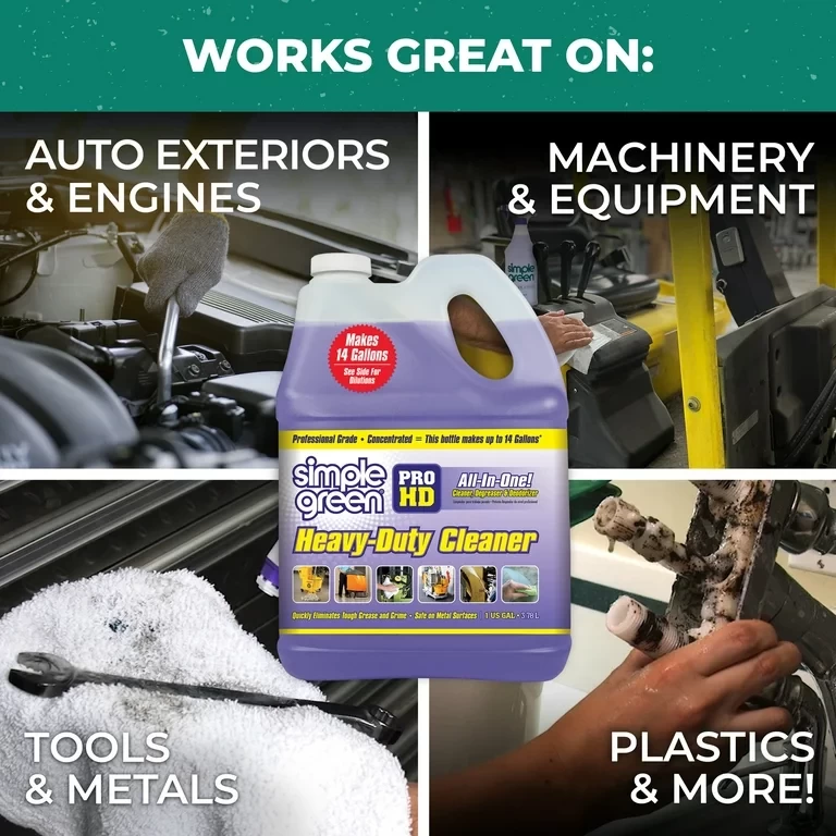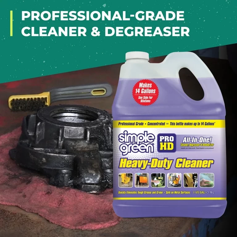 Simple Green Pro HD is a heavy-duty cleaner and degreaser that breaks down tough grease and grime. This powerful formula removes dirt and stains from a wide variety of surfaces including engines, car exteriors, tools, machinery, floors, walls, and more. Formulated with a corrosion inhibitor making it ideas for metals. It's also non-degrading to plastics and clean rinsing. The cost-effective concentrate can be custom diluted for specific cleaning jobs and used in pressure washers, carpet cleaners, floor scrubbers, ultrasonics, dip tanks, and other cleaning equipment. Pro HD provides an effective alternative to solvents and other harsh cleaning chemicals without sacrificing performance.