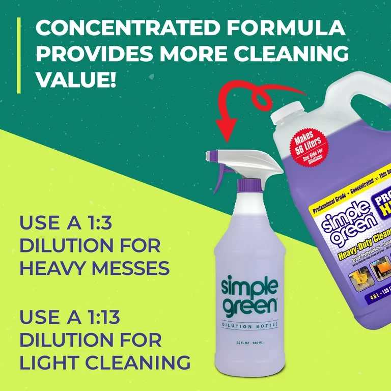 . Great for Pressure Washing: Water plants and lawn around area to be cleaned. Drop siphon hose into bottle or pre-mix according to equipment instructions. Pressure wash vertical surfaces from bottom to top and rinse from top to bottom. Rinse plants and lawn with water again after cleaning is done. Strength: Example: . Heavy: 1 Cup Pro HD + 3 Cups Water, Dilution: 1:3. Medium: 1 Cup Pro HD + 5 Cups Water, Dilution: 1:5. *Light: 1 Cup Pro HD + 13 Cups Water, Dilution: 1:13. Concentrated = This bottle makes up to 14 gallons*. Directions: Spot test on an inconspicuous area first. Mix with water for severity of soil. Apply to surface via spray, mop, or wipe. Allow several minutes contact before rinsing. For best result, rinse or damp wipe.
