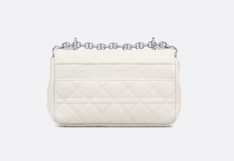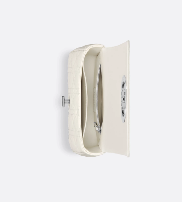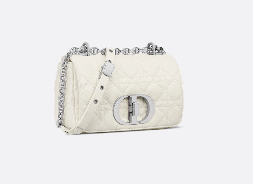 The Dior Caro bag combines modernity with timeless elegance. The style is crafted in latte supple calfskin with Cannage stitching. The bag showcases a flap adorned with a silver-finish metal CD twist clasp, inspired by the seal of a Christian Dior perfume bottle. The detachable chain strap with CD signature links allows the small bag to be carried by hand, worn over the shoulder or crossbody, and may be replaced by one of the House's wide embroidered straps for day or evening attire.