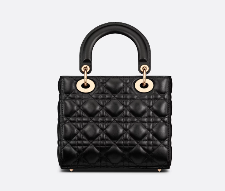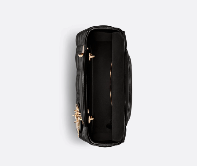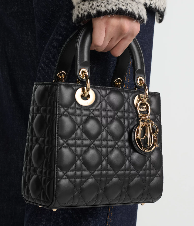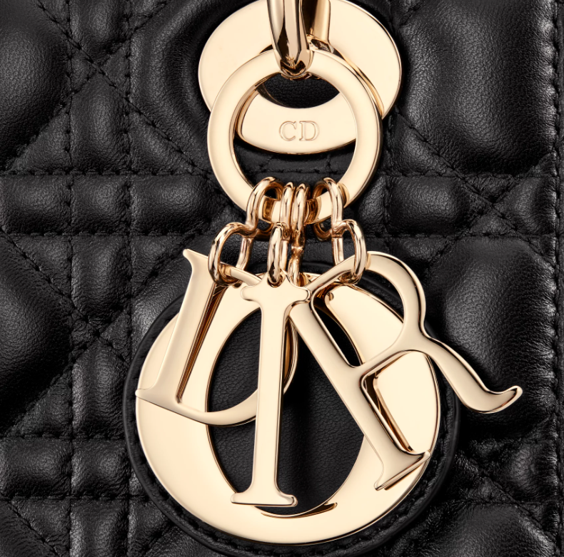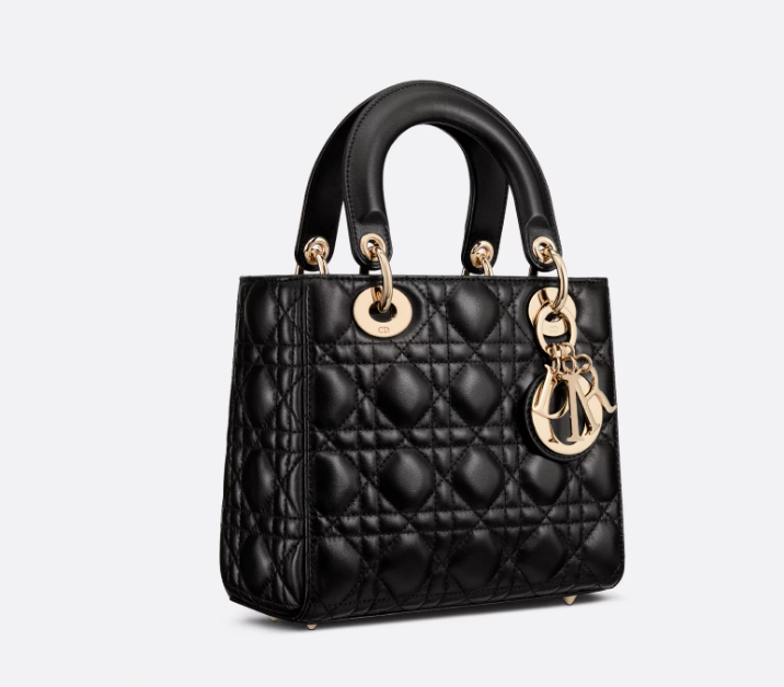 The Lady Dior My ABCDior bag epitomizes Dior's vision of elegance and beauty. Sleek and refined, the timeless style is crafted in black lambskin with Cannage stitching, creating the instantly recognizable quilted texture. Pale gold-finish metal D.I.O.R. charms offer elegant appeal. Featuring a shoulder strap that can be personalized with badges, the small, unique design may be carried by hand or worn crossbody.