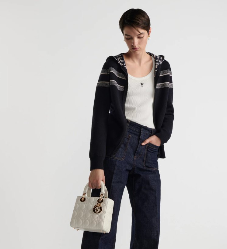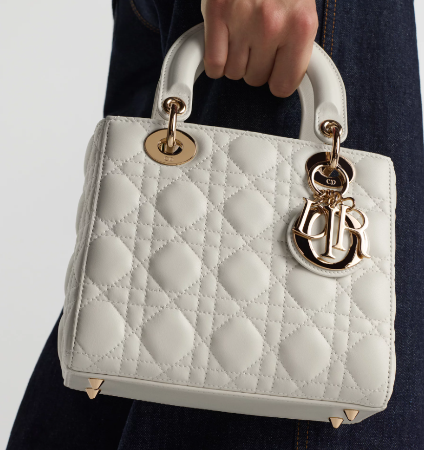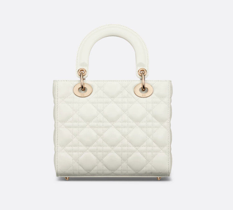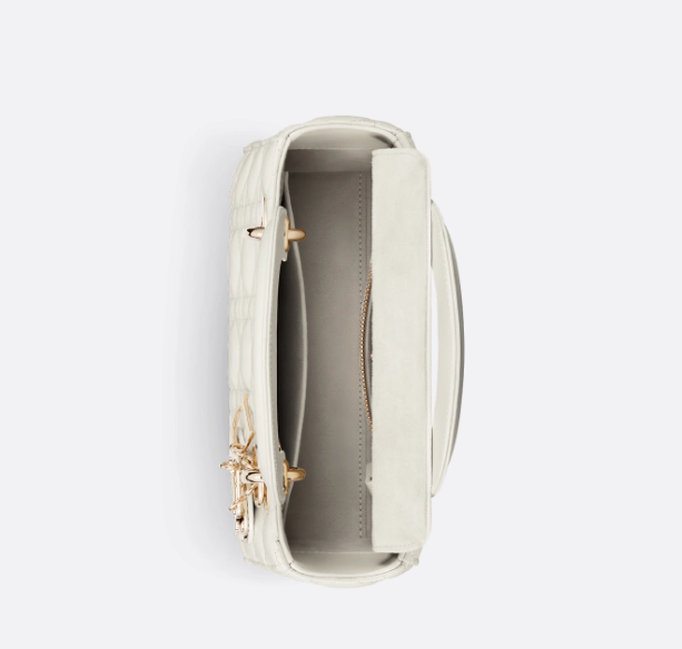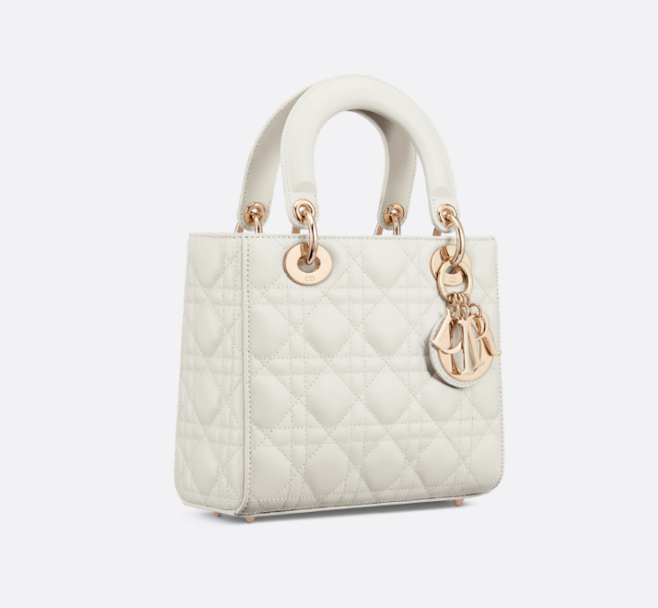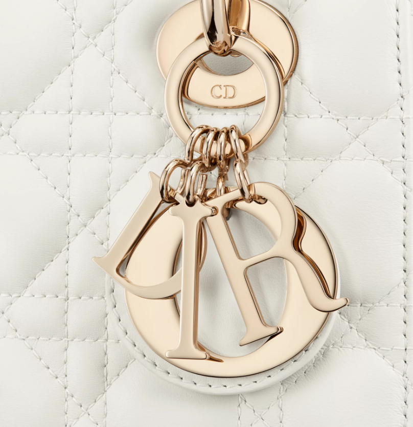 The Lady Dior My ABCDior bag epitomizes Dior's vision of elegance and beauty. Sleek and refined, the timeless style is crafted in latte lambskin with Cannage stitching, creating the instantly recognizable quilted texture. Pale gold-finish metal D.I.O.R. charms further embellish its silhouette with an elegant touch. Featuring a shoulder strap that can be personalized with badges, the small, unique design may be carried by hand or worn crossbody.
