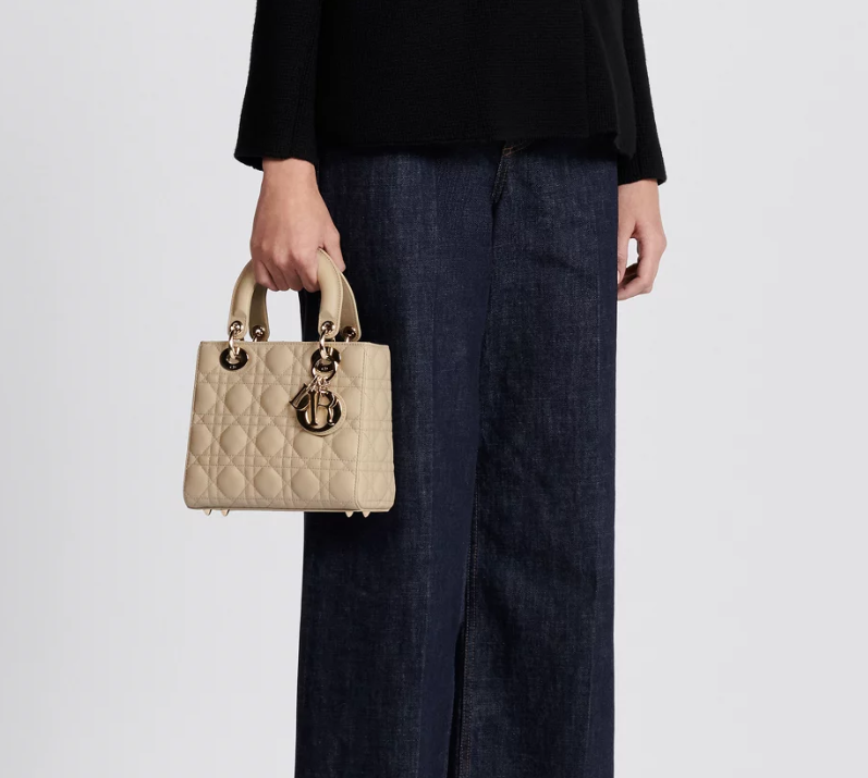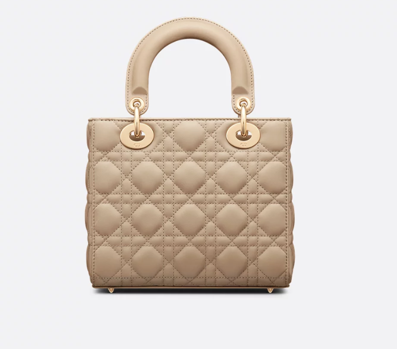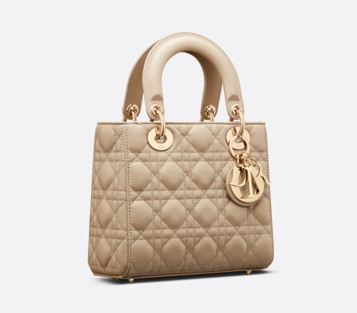The Lady Dior My ABCDior bag epitomizes Dior's vision of elegance and beauty. Sleek and refined, the timeless and modern style is crafted in sand-colored lambskin with Cannage stitching, creating the instantly recognizable quilted texture. Pale gold-finish metal D.I.O.R. charms further embellish its silhouette with an elegant touch. Featuring a shoulder strap that can be personalized with badges, the small, unique design may be carried by hand or worn crossbody.