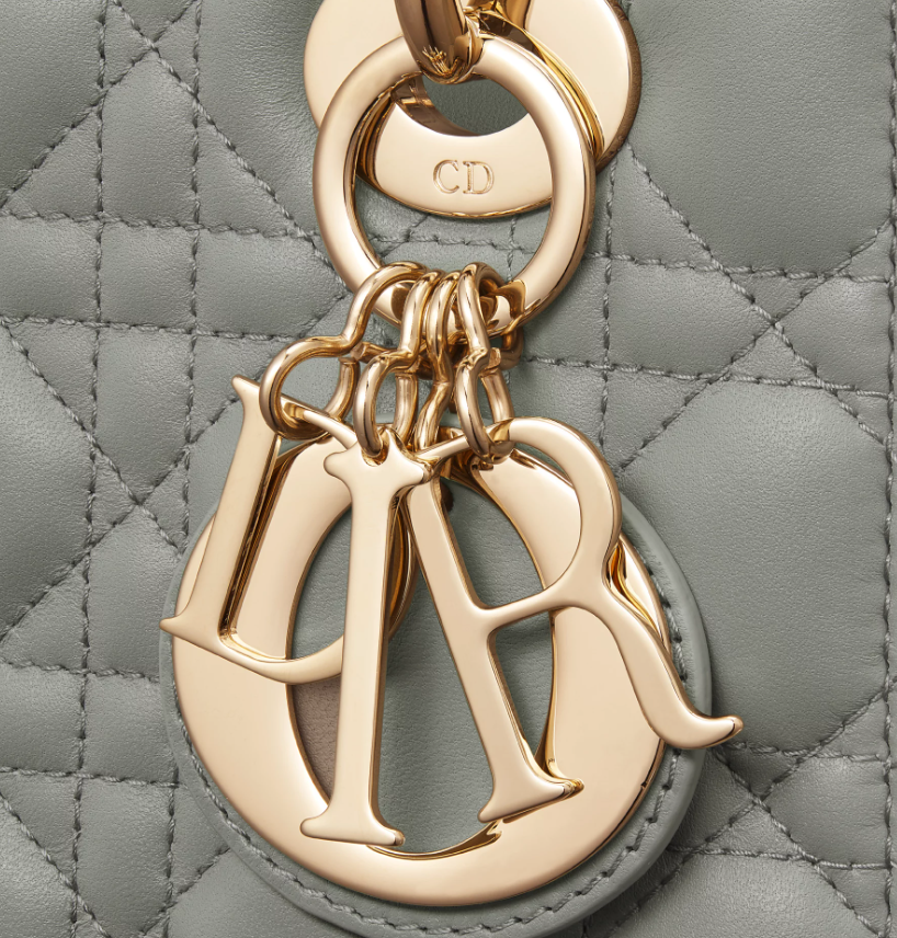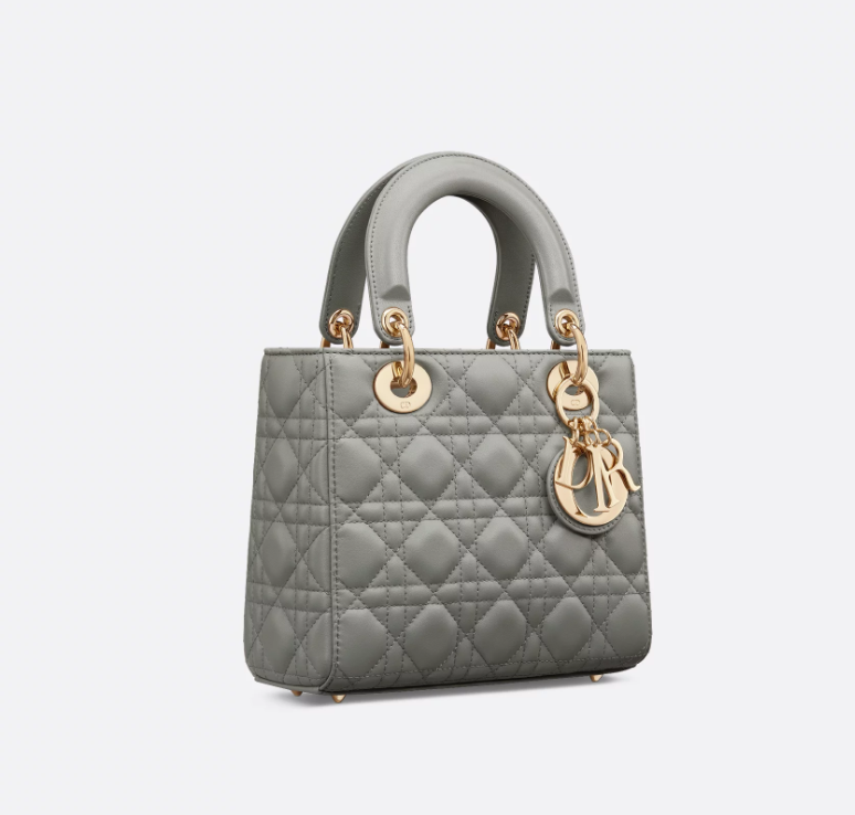 The Lady Dior My ABCDior bag epitomizes Dior's vision of elegance and beauty. Sleek and refined, the timeless style is crafted in stone gray lambskin with Cannage stitching, creating the unmistakable quilted texture. Pale gold-finish metal D.I.O.R. charms offer elegant appeal. Featuring a strap that can be personalized with symbolic badges, the small, unique design may be carried by hand or worn crossbody.