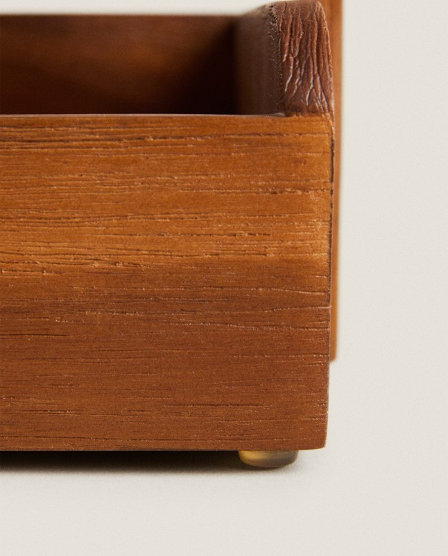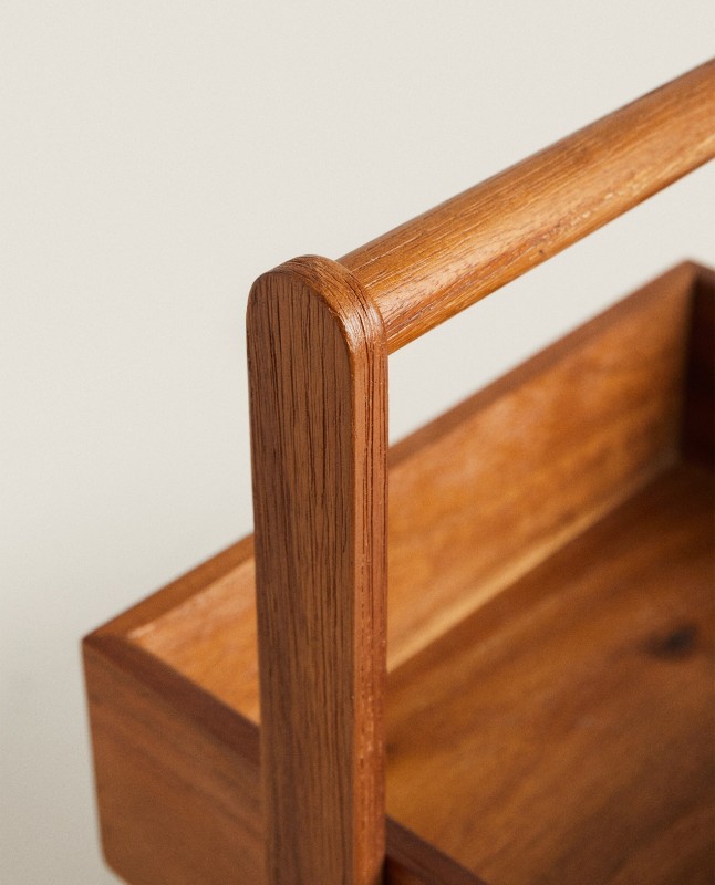 This contemporary-style acacia wood storage unit combines two storage spaces at different heights.