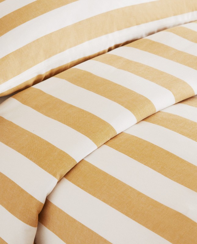 Duvet cover with a contrasting wide stripe design. Made of dyed thread.