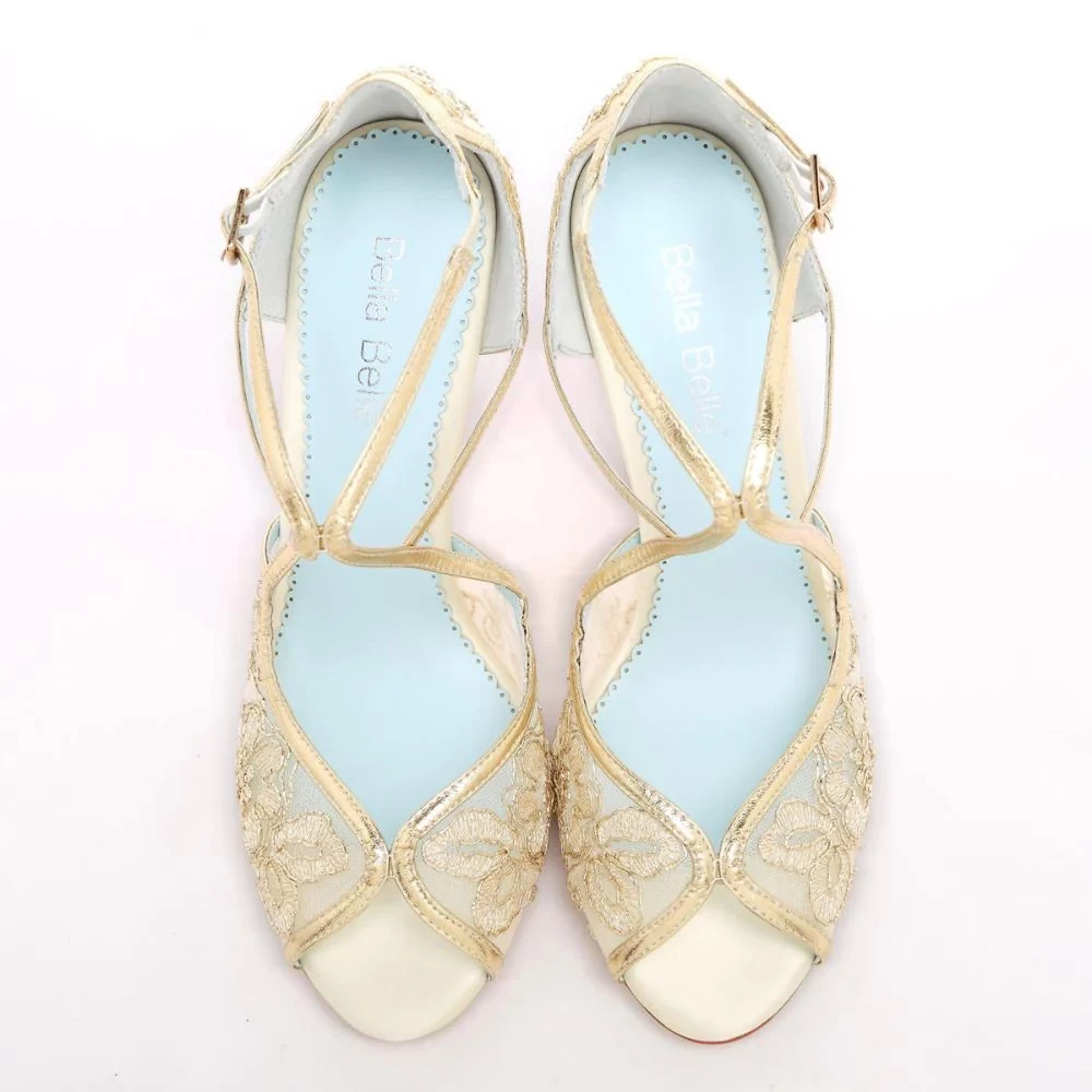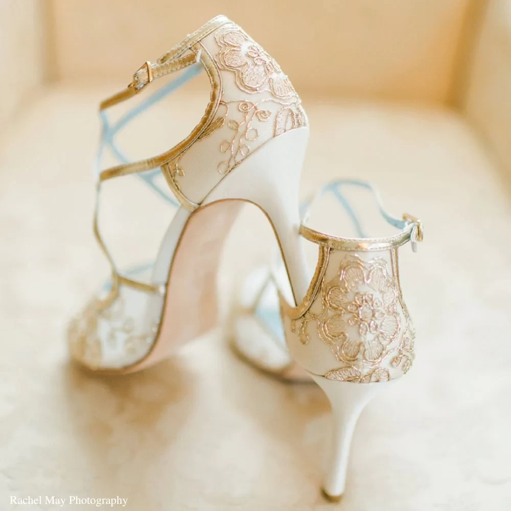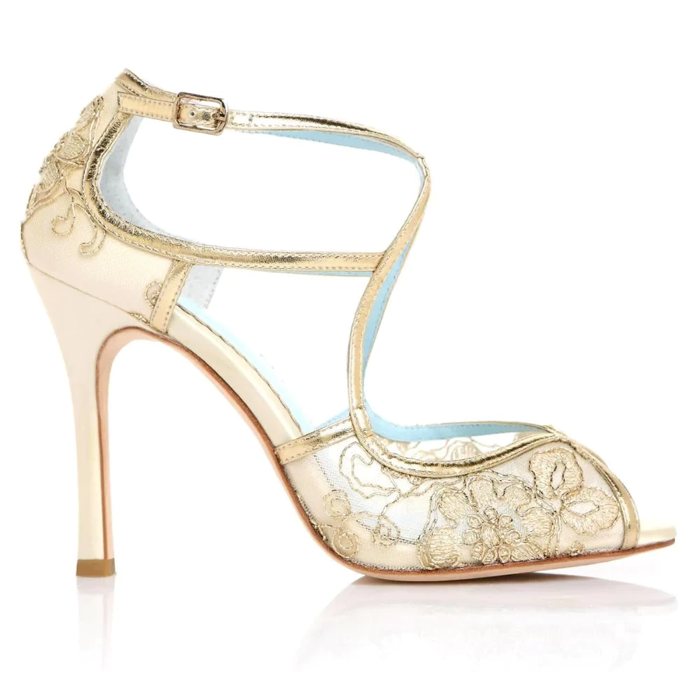 Glamour meets lady-like vintage describes these gold lace high heels with criss-cross leather straps for secure fitting, ivory silk wrapped heel, and an open toe design for you to show off your pedicure. Tess gold lace heels have blue sole shoes to check off that 'something blue' element. Bonus? You can easily re-wear Tess after your wedding