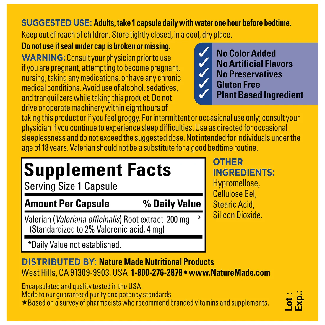 Get triple action sleep support with Nature Made® Valerian Root Capsules. One capsule provides 200 mg of Valerian Root extract to support restful sleep and help you stay asleep longer and fall asleep faster in as little as 3 days when taken daily.†