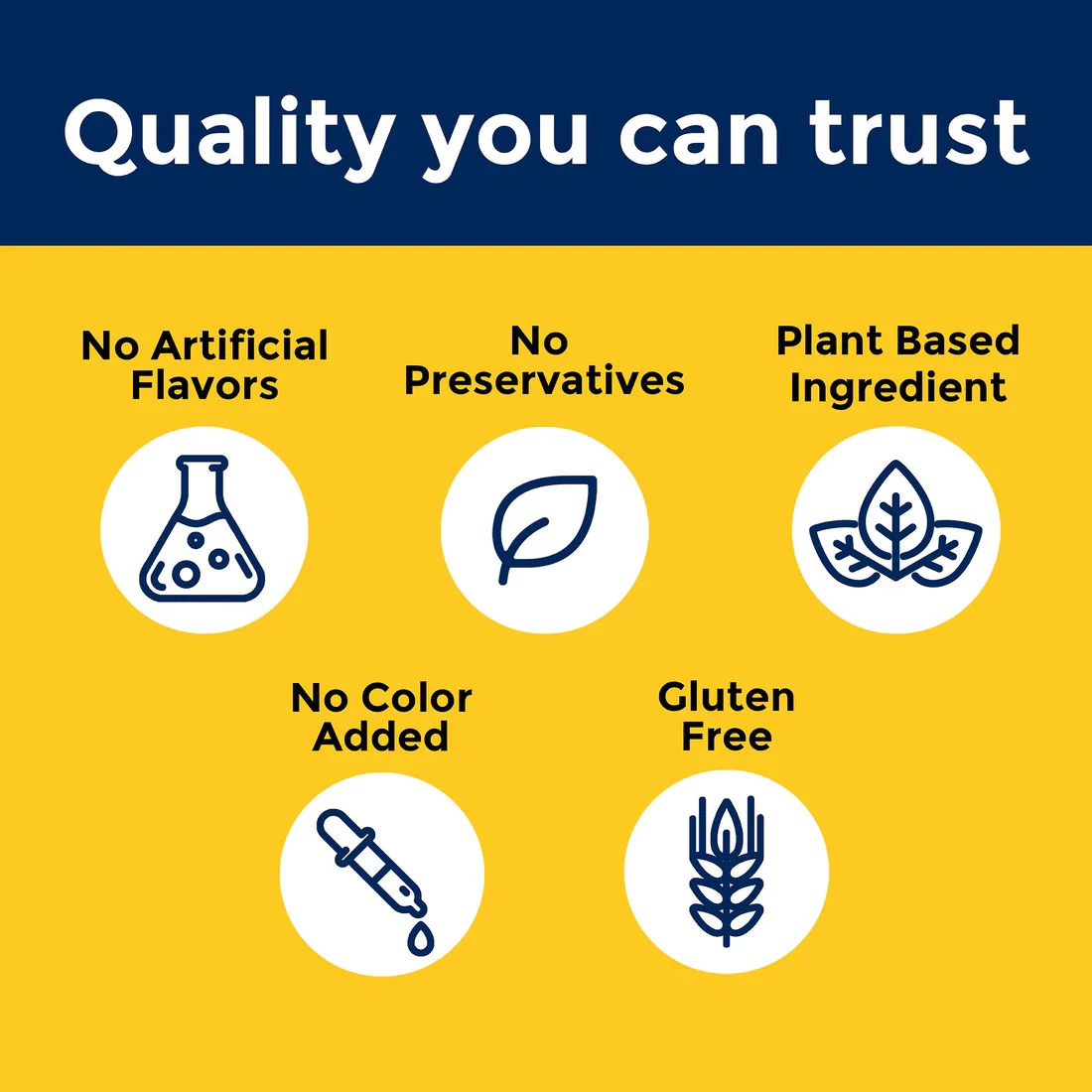 - No color added, no artificial flavors, no preservatives, gluten free, plant based ingredient