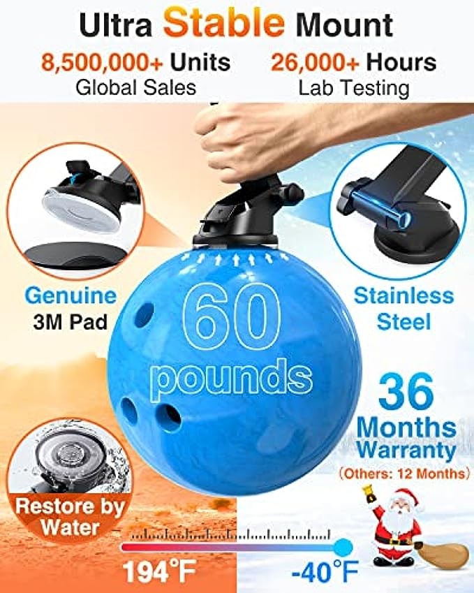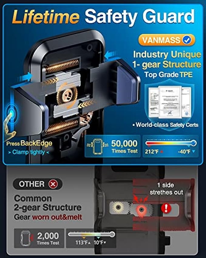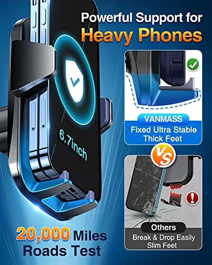 【Philosophy of Chief Designer】It's my star work among 100+ car holder designs, which recovers originally simple. Simplicity is a philosophy & joy & life attitude. Wish the simple product & service can please you. Expecting your opinions to grow my baby. 【Patented Multi-scene Design: Car/Desk/Kitchen/Bathroom/Gym】VANMASS car phone holder brings sticky suction cup & steel-cored vent clip from 3000+ surveys. Ideal present for your specials. Luxury look & structure was certified by RoHS, CP65, REACH. 【Original 4 Technologies- Thanks to Millions of Users' Voice】1) Extreme -40~194℉ Weather resistance from precious KING of plastic 2) Super suction power up to 44LBS 3) Extra pad for smooth surface 4) Steel-cored 3-Level Clip: 20X stable & durable. 【Millions of Users Preferred 0.96” Width Bottom Tray - Easy to Touch HOME button & Unlock screen & Plug charge cable】Upgraded from flimsy drop-down bottom tray, the solider & wider bottom tray can support any weight phone on the bumpy road. 【Luxury Present: Top-notch Configuration & Profound Package】Exquisite car phone mount (suction cup/vent clip/pad) is fully protected in Elegant & Eco-friendly box. V-shaped pattern on the package means Vibrant & Victory to you and your special one. ATTENTION: The LEATHER dashboard is NOT suitable for ALL suction cups. Please use the mount on the windshield or air vent instead. [Depth of Phone Cradle]: 0.7" (Thick Case Compatibility)