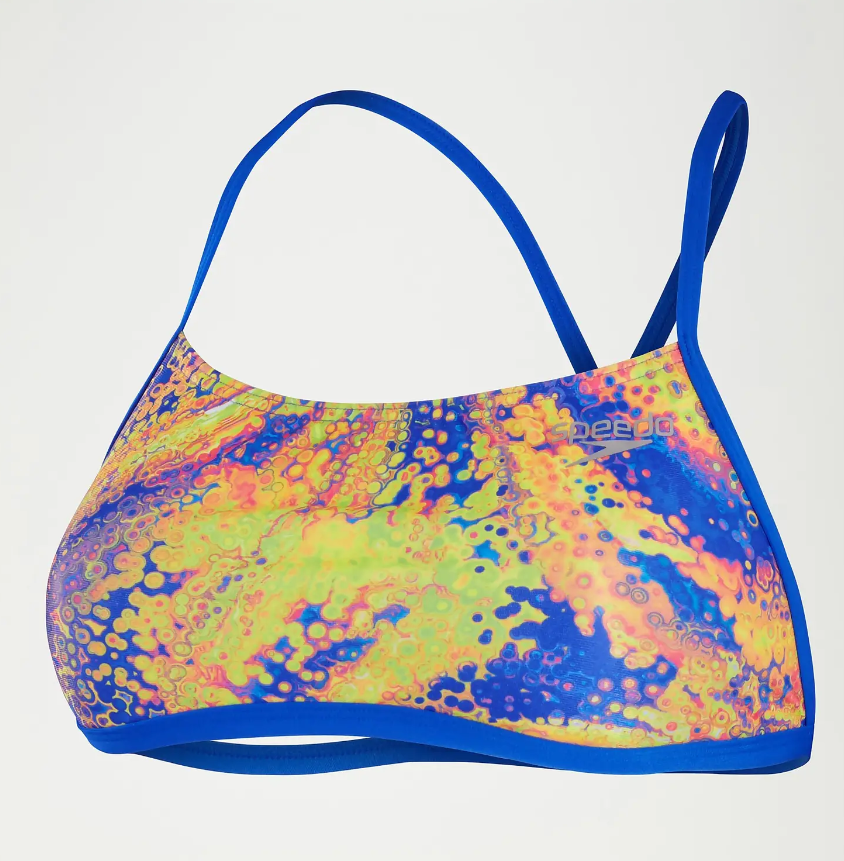 Long drill sets are no match for this stylish Cross-Back Crop Top, which features our eye-catching ‘Cosmic Distortion’ print in psychedelic colours. Helping you wave bye-bye to boring, the thin crossback straps sit between your shoulder blades, allowing great freedom of movement so you can train hard and feel great. Fully lined in True Cobalt for comfort and modesty. Made from our durable ECO Endurance+ fabric, it's quick-drying and 100% chlorine resistant. Plus, one of the yarns in this fabric is made from 100% post-consumer waste, such as recycled plastic bottles.