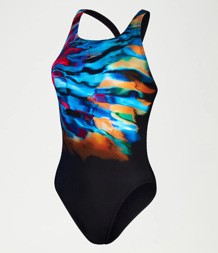Cruise through your workout wearing this stylish black Leaderback swimsuit, featuring submerged ripples of intense blue and pink. The open back leaderback style is designed for training and includes narrow straps to aid shoulder movement and flexibility, plus a high cut leg to maximise range of motion. The suit is front lined for comfort and modesty in and out of the water. Made from our durable ECO Endurance+ fabric, it's quick-drying and 100% chlorine resistant. Plus, one of the yarns in this fabric is made from 100% post-consumer waste, such as recycled plastic bottles.