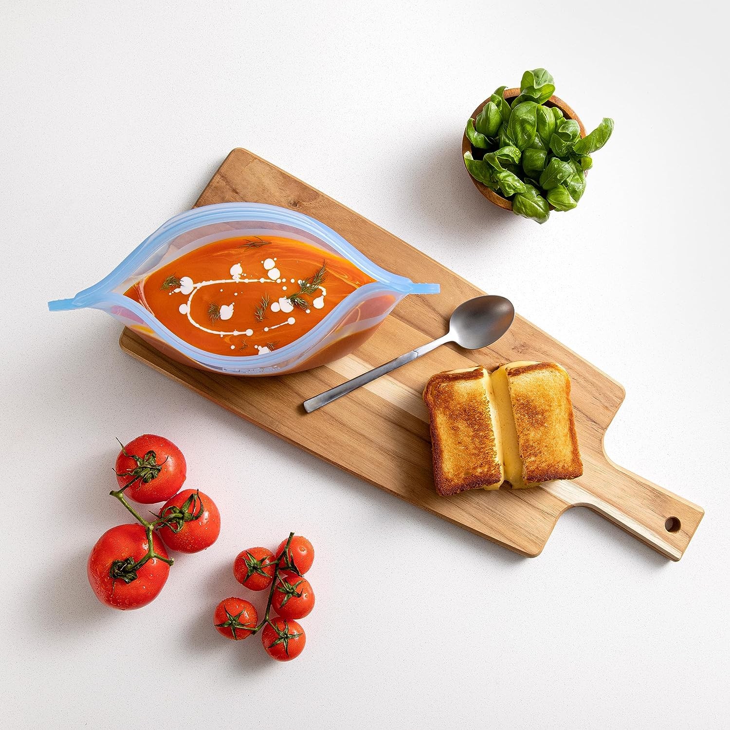 Durable, reusable silicone, Large Pouch is perfect for family dinners and holds up to 8 cups, Medium Container holds up to 4 cups and features a wide base with feet to help with standing and filling