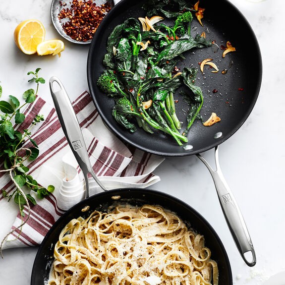 Made in Italy, ZWILLING Forte is 20x more durable than traditional nonstick with an improved resistance to scratches and abrasions. Make quick work of small jobs like melting butter and heating up soup in the 2-quart saucepan, or toast nuts and fry an egg for one in the 8-inch fry pan. Tackle larger tasks like sautéing vegetables and whipping up sauces in the 4-quart sauté pan, and prepare stocks and soups in the 8-quart stock pot.
