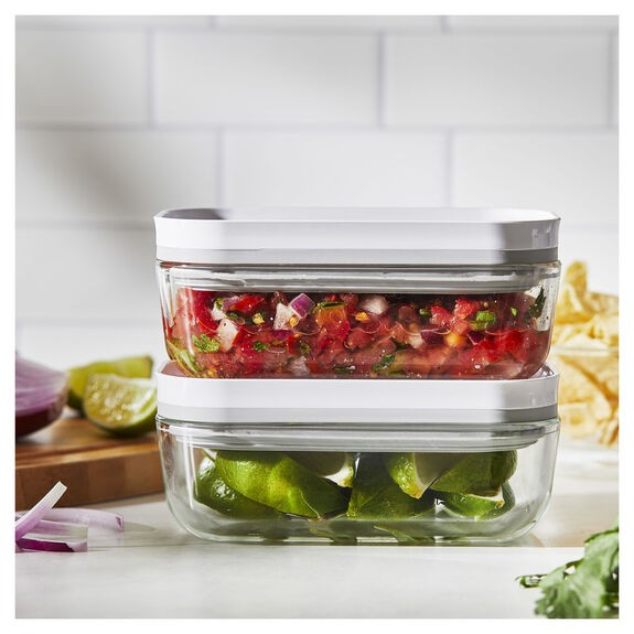 The Fresh & Save vacuum containers are designed to work with the vacuum pump to keep food fresh up to five times longer than non-vacuum storage. This set of 2 borosilicate glass containers is nestable and freezer, microwave (without vacuum seal), and dishwasher safe. The glass containers are ovenproof (without lid) and double as beautiful serving pieces at the table. These small containers are roomy enough so that you can store an entire leftover dinner.